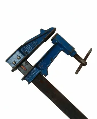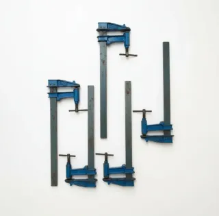 Lote de cinco sargentos de la marca PIHER. Herramientas robustas para trabajos de carpintería o bricolaje. - Sargentos de metal azul. - Mango de apriete. - Barra de sujeción.