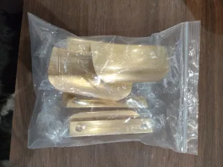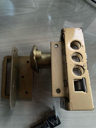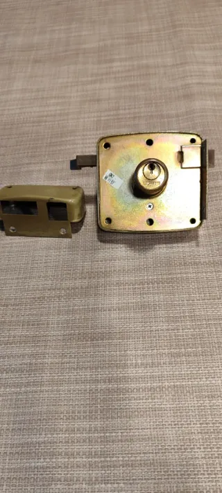 Cerradura de puerta con acabado dorado. Incluye la pieza de encaje. - Medidas aproximadas: 10x9cm.