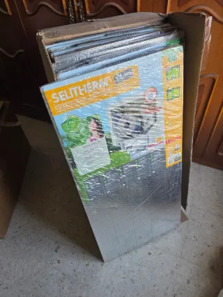 Vendo 7 unidades de aislamiento térmico para la caja de la persiana, ideal para mejorar la eficiencia energética de tu hogar. - Material reflectante plateado. - Diseño con cuadrícula. - Fácil de cortar e instalar. Vendo cada unidad a 15€.