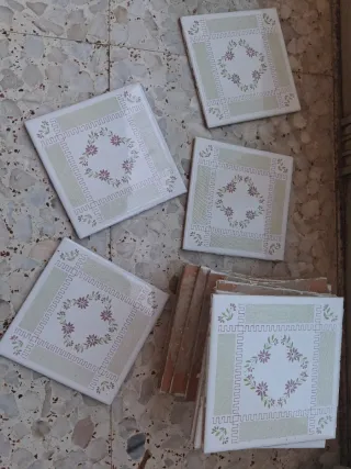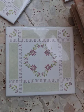 Tengo 22 piezas de azulejos con un diseño floral en tonos rosas y verdes sobre fondo blanco. - Diseño central con flores y hojas. - Bordes decorativos con motivos geométricos.