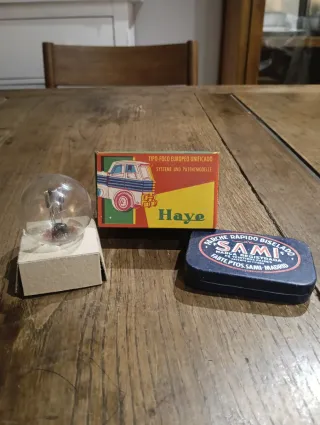 Conjunto de una bombilla Haye y una caja metálica de la marca Sami. - Bombilla de cristal de 1960. - Caja metálica con diseño vintage de 1940. - En inmejorable conservación para la antigüedad de los dos productos.