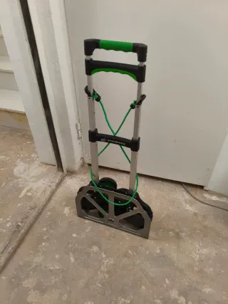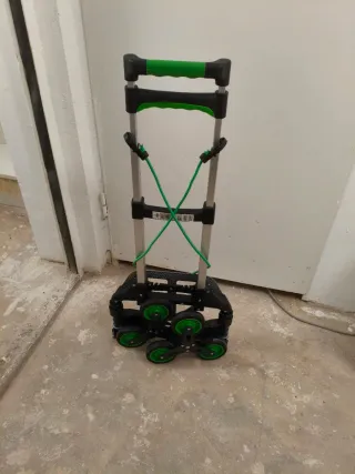 Carretilla plegable diseñada para facilitar el transporte de cargas pesadas, especialmente en escaleras. Su estructura es robusta y permite mover objetos de hasta 70 kg. - Capacidad de carga: 70 kg. - Diseño plegable para fácil almacenamiento. - Ruedas adaptadas para escaleras.