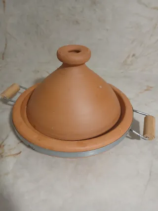 Auténtico tagine marroquí de barro, perfecto para cocinar platos tradicionales. - Material: Barro. - Diseño cónico. - Asas laterales.