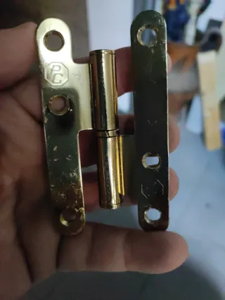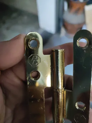 Se venden bisagras de latón nuevas, ideales para puertas o muebles. Tienen un acabado brillante y elegante. 1 UD. 3.5€ las 11ud.en caja 30€. - Material: Latón. - Acabado: Dorado brillante. - Diseño: Clásico con dos placas y pivote central.