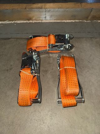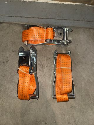 Set de tres cintas de sujeción de color naranja, ideales para asegurar cargas. - Fabricadas en material textil resistente. - Mecanismo de trinquete metálico para un ajuste firme. - Longitud de cinta visible para sujeción.