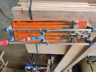 Cortadora de azulejos de la marca tomecanic, modelo Intercut 300. - Base roja. - Rieles de metal. - Mango negro.