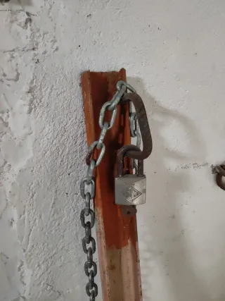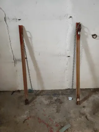 Set de postes de hierro con cadena y candado, ideal para el cierre de fincas o accesos. - Dos postes de hierro - Cadena metálica. de unos 3.5mts. - Candado incluido.