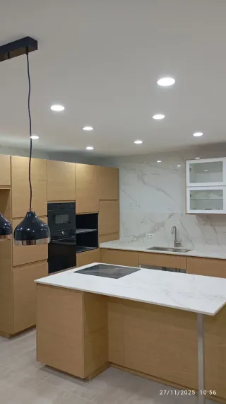 Se vende cocina completa con acabados en madera y encimera de mármol. Ideal para renovar tu hogar. - Muebles de cocina de madera. - Encimera de mármol. - Electrodomésticos integrados (horno, vitrocerámica). - Isla central con vitrocerámica. - Lavabo de acero inoxidable.