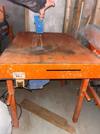 Sierra de mesa con estructura naranja y superficie de trabajo. - Motor con conexión a 230 V. - Guía de corte azul.