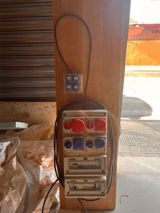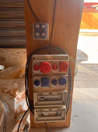 Panel de control eléctrico con varias tomas de corriente y protecciones. - Cuatro tomas de corriente azules de 32A. - Tres tomas de corriente rojas de 32A. - Dos cajas de fusibles con varios interruptores.