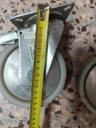 Dos ruedas giratorias de alta resistencia, ideales para muebles o carritos. - Fabricadas en metal y plástico. - Diámetro de rueda aproximado: 75 mm. - Incluyen freno en una de las ruedas.