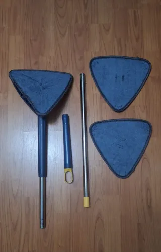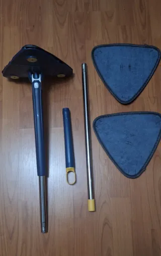 Set de mopa triangular para limpieza de suelos, ideal para azulejos y otras superficies. - Incluye mango extensible. - Viene con tres paños de microfibra. - Diseño triangular para llegar a esquinas.