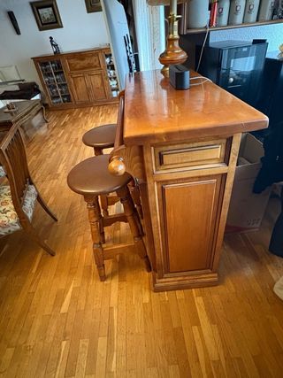 Barra de bar de madera maciza con un diseño clásico y elegante. Perfecta para complementar tu espacio. - Fabricada en madera maciza. - Incluye dos taburetes a juego. - Acabado en tono madera cálido.