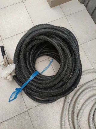 Rollo de tubo corrugado de color negro, y blanco ideal para instalaciones eléctricas. - Material flexible y resistente. - Diámetro aproximado visible en la imagen.
