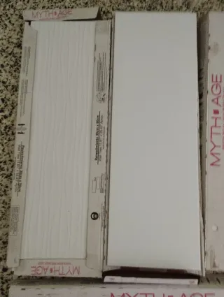 Azulejos de la marca Myth Age, con un diseño texturizado y acabado mate. - Medidas: 30cm x 90cm. - Textura ondulada. - Color blanco. Hay 3 cajas de blanco liso y 4 de blanco con "rayitas" No se hacen envíos 9€ cada caja.