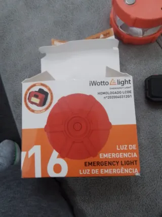 Luz de emergencia portátil de la marca iWotto Light, modelo V.16. - Diseño compacto y redondo. - Color naranja. - Incluye manual de instrucciones en portugués y español.