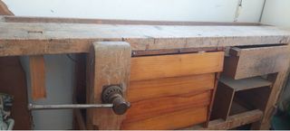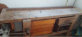 Mesa de carpintero antigua, ideal para taller o como pieza decorativa rústica. Fabricada en madera maciza. - Superficie de trabajo amplia y resistente. - Incluye tornillo de carpintero. - Cajón y estantes para almacenamiento. Largo: 201 Fondo: 51 Alto: 85