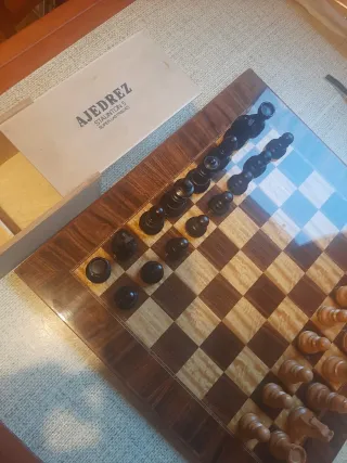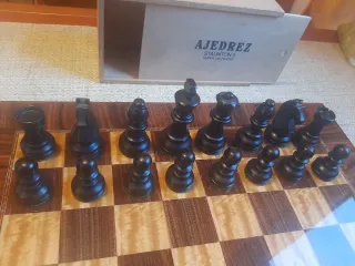 Conjunto de tablero y piezas de ajedrez modelo Staunton 5. Antiguo - Tablero con diseño clásico a cuadros. - Piezas de ajedrez de madera. Estado casi perfecto como se pueden ver en las fotos. La única pieza "dañada" un poco es la reina en una punta. Se ve en la foto Si solo quieres las piezas y su caja 50€. El pack 80€ piezas y tablero. Posibilidad de recogida en mano en Palencia en la tienda de Discos Estación Sonora en Palencia capital. Más material en mi perfil. Envíos a prueba de bombas 💣.