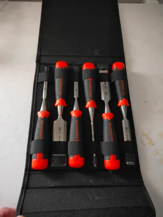 Set de seis formones de la marca bahco, ideales para trabajos de carpintería y ebanistería. Vienen organizados en un estuche. - Mango ergonómico. - Cuchillas de acero. - Incluye estuche de almacenamiento.