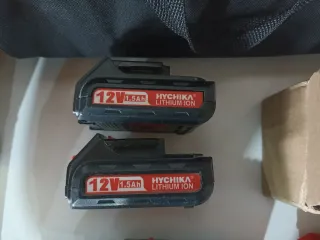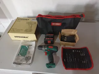 Taladro inalámbrico Hychika de 12V, usado en 4 ocasiones prácticamente nuevo, ideal para trabajos en casa o profesionales. Incluye varios accesorios para diferentes tareas. - Taladro Hychika 12V - Batería de 1.5Ah Li-ion - Cargador - Bolsa de transporte - Juego de brocas y puntas