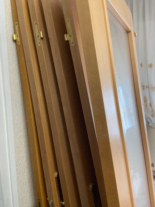 Vendo ventana de madera con un diseño antiguo. Tienes sus dos cuarterones con sus cierres cerrojos....sta completa a falta d restauracion....los cuarterones u hojas son los d las fotos, stan desmontados del marco pero encajan perfectos. Presenta una combinación de pintura desgastada en tonos anaranjados y azulados, la pintura sale sola lijando y la madera sta buena. Ideal para proyecto restauracion coleccion antiguedades....se aceptan ofertas - Estructura de madera. - Pintura desgastada.