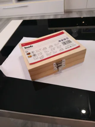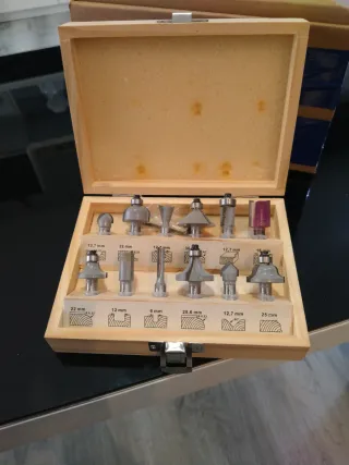 Set de fresas para madera en su caja original. - Incluye 11 fresas de diferentes tamaños y formas. - Medidas visibles: 22 mm, 12.7 mm, 30 mm, 6 mm, 28.6 mm, 12.7 mm, 25 mm. - Caja de madera para almacenamiento.