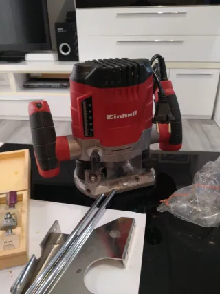 Fresadora Einhell en color rojo, ideal para trabajos de carpintería. - Incluye accesorios. - Mango ergonómico para un mejor agarre. -Juego de 12 fresas diferentes medidas y fresa adicional Bosch 18mm