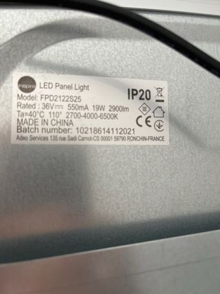 Panel de luz LED Inspire FPD2122SZ5 en perfecto estado. Funciona con 36V y consume 19W para una luminosidad de 2900 lúmenes. Temperatura de color 2700-4000-6500K. Medidas 60x30. - Modelo: FPD2122SZ5 - Potencia: 19W - Flujo luminoso: 2900 lúmenes - Temperatura de color: 2700-4000-6500K - Protección IP20