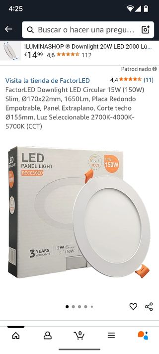 tengo 6 y una de superficie 6€ cada una son luz calida se hace precio si se llevan todas juntas. Panel LED redondo de la marca Wurth, ideal para iluminar espacios interiores. - Potencia: 20W - Temperatura de color: 4000K (blanco neutro) - Corriente de salida: 375mA - Voltaje de entrada: 100-240V AC - Voltaje de salida: 40-50V DC - Dimensiones del driver: 100x45x28mm - Rango de temperatura de operación: -20°C a +40°C