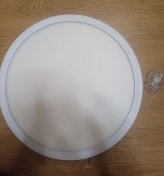 Panel LED circular para techo, con un acabado blanco y un marco plateado. En buen estado. Ilumina perfectamente una cocina. - Diámetro: 400 mm. - Voltaje: 230V. - 4000k