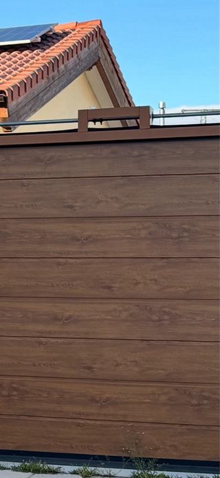 Portón seccional tipo sándwich con acabado imitación madera. Se desmonta por reforma. 3300 ancho 2040 alto Menos de 3 años NEGOCIABLE - Paneles aislantes. - Color marrón