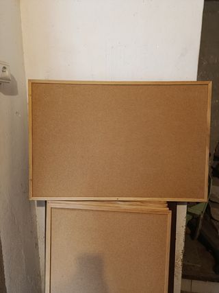 Panel de corcho con marco de madera. - Medidas: 59x40 cm. - Tiene 2 caras: una normal y la otra pegajosa ( ya venía asi) ,para pegar sin chinchetad