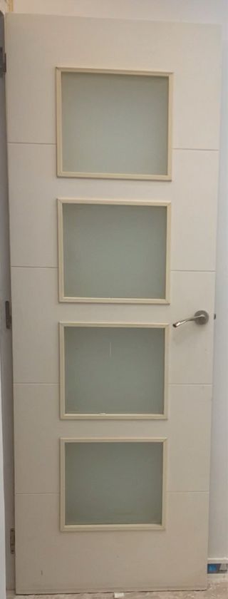 Puerta de paso de color blanco con un diseño moderno. - Cuatro paneles de vidrio traslúcido. - Marco de vidrio en color crema. Los marcos alrededor del cristal una vez lijados y pintados, quedarán como nuevos. Incluye la maneta plateada. Peso 22-25 Kg. Solo recogida, planta 7 en Hospitalet. Es probable que no quepa en el ascensor.