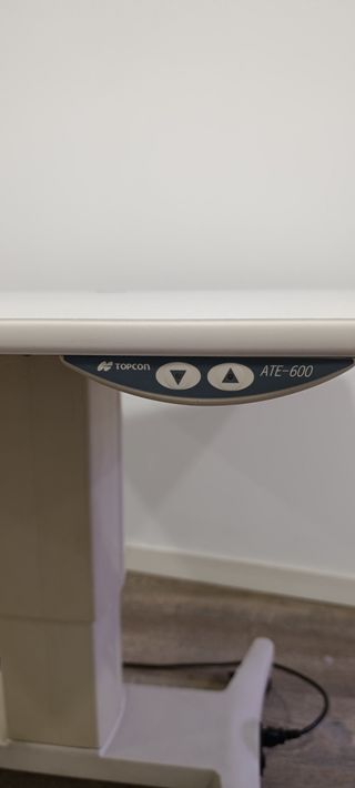 Mesa elevadora de la marca Topcon, modelo ATE-600. Su diseño permite ajustar la altura fácilmente. - Base con ruedas para movilidad. - Panel de control integrado en la superficie. - Estructura robusta y estable.