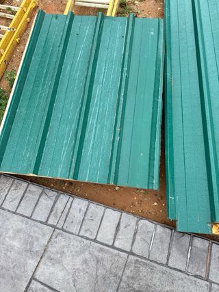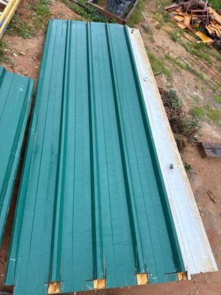 Panel de chapa sandwich para construcción. unas de las chapas tiene un corte en el lateral se aprecia en la última foto - Color verde. - Acabado metálico. -2 chapas sándwich de 3x1 m -1 retal de 1x1,36m