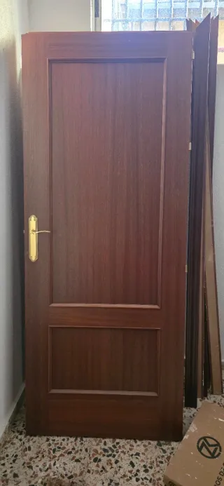 Puertas interiores de madera con un diseño clásico - Acabado en tono caoba. - Incluye manilla dorada. - Paneles de madera. - Marco de madera a juego. Precio en total por 6 puertas