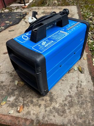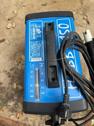 Soldador de electrodo de color azul brillante, con asa de transporte negra. - Diseño compacto y robusto. - Panel frontal con indicadores y selector de amperaje. - Conexiones para cable de masa y portaelectrodos.