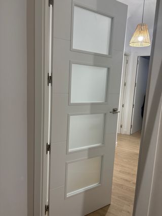 Se venden 7 puertas interiores de madera, 5 ciegas y 2 con cristales, 1 de ellas corredera. De las ciegas, 4 abren a derechas y 1 a izquierdas. La de cristal abre a derechas. La corredera de cristal corre a izquierdas. - Se venden por separado a 50 euros. - Acabado en blanco. - Panel inferior con relieve. - Cristal translúcido.
