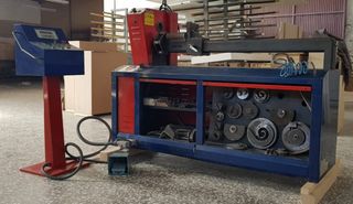 Máquina torsionadora de uso industrial, ideal para talleres y fábricas. - Panel de control con pantalla digital. - Base robusta de color rojo y azul. - Incluye pedal de operación.