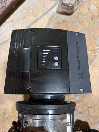 Bomba de agua de la marca Grundfos. Cuenta con una pantalla digital y botones de control. - Diseño moderno en color negro. - Panel de control con indicadores visuales. - Botones de ajuste. - Marca Grundfos visible en el lateral.