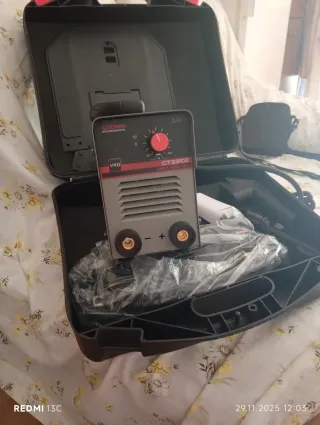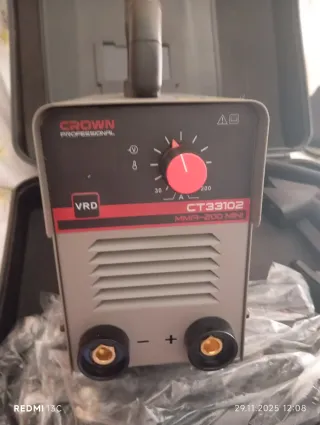 Soldador de la marca Crown, modelo CT33102 MMA-200 Mini. - Diseño compacto y portátil. - Panel frontal con dial de ajuste y conectores. - Indicadores de VRD y símbolos de seguridad.