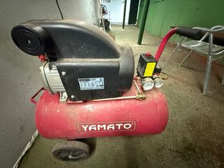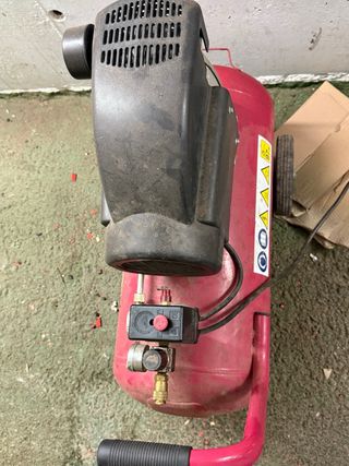 Compresor de aire de color rojo. Incluye un asa para facilitar su transporte. - Ruedas para movilidad. - Panel de control con manómetro.