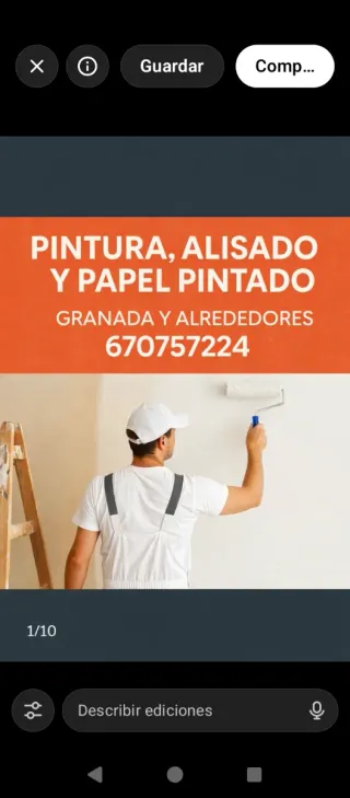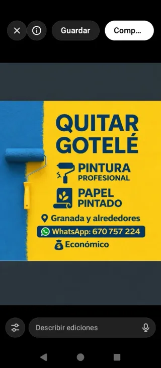 “👨🎨 Pintor en Granada con experiencia. Ofrezco: ✅ Pintura de paredes y techos (viviendas y locales). ✅ Quitar gotelé y alisar paredes y techos. ✅ Colocación de papel pintado de cualquier tipo. 🎨 Trabajo rápido, limpio y profesional. 📩 Escríbeme para presupuesto sin compromiso. 📍 Granada y alrededores.” Teléfono: 642 590 920 Whatsapp: +34 642590920