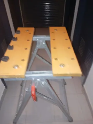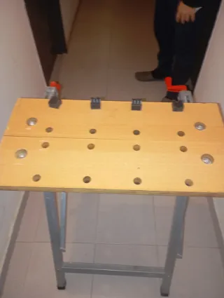 Mesa de trabajo robusta y práctica, ideal para proyectos en casa o en el taller. Su diseño plegable facilita su almacenamiento y transporte. - Superficie de madera. - Patas metálicas resistentes. - Incluye abrazaderas.