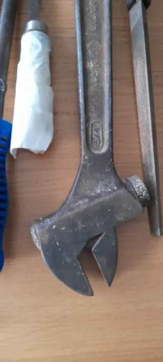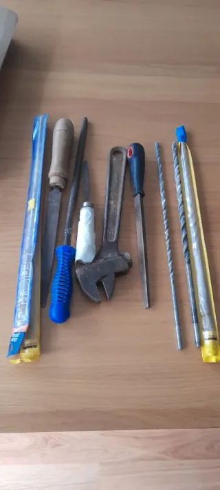 Conjunto de herramientas variadas para diferentes tareas. - Lima de metal - Llave inglesa - Destornillador - Brocas para taladro