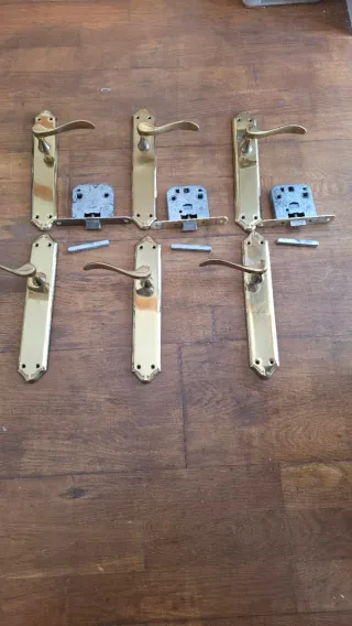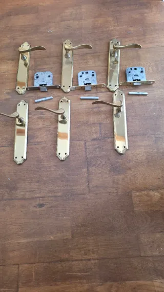 Conjunto de manillas doradas para puertas de paso. - Diseño elegante y clásico. - Acabado en color dorado. Juego de tres conjuntos de manillas con cerradura . Precio para cada conjunto de 2 manillas y cerradura 11€