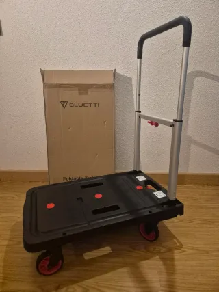 Carretilla plegable de la marca Bluetti. Precio nuevo en web 199.00 - Plataforma de carga 137 kilos de capacidad. - Ruedas para facilitar el transporte. - Carretilla plegable, ocupa poco espacio y resistente. Ideal para transportar Estaciones de energía de Bluetti o cualquier otra marca. También vale para otros articulos pesados. ADVERTENCIA - No se siente ni se pare en el carro - LÍMITE DE PESO: 300 lbs/137 kg - No apile mercancías por encima del nivel de la cintura. - Evite rodar en dirección diagonal - Centre la carga uniformemente en la placa - Evite transportar mercancías frágiles - Evite movimientos bruscos