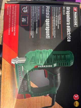 Grapadora eléctrica Parkside PET 25 C3. Envio, se puede entregar en Madrid o Toledo - Número máximo de percusiones: 30 ipm. - Preselección de la fuerza de impacto continua. - Mecanismo disparador con seguro triple. - Incluye 500 grapas (200 de 15 mm / 300 de 25 mm) y 500 clavos (200 de 25 mm / 300 de 32 mm). - Incluye 1 llave hexagonal.