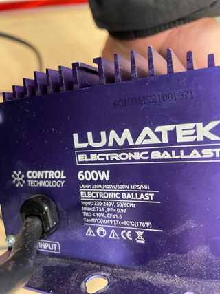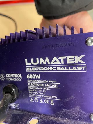 Balastro electrónico Lumatek de 600W para lámparas HPS/MH y led - Potencia: 600W. - Voltaje de entrada: 220-240V, 50/60Hz. - Corriente máxima: 2.75A. - Factor de potencia: >0.97. - Distorsión armónica total (THD): <10%. - Factor de cresta (CF): ≤1.6. - Temperatura de operación: Ta=40°C (104°F), Tc=80°C (176°F).
