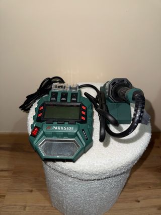 Soldador electrónico de la marca Parkside, ideal para trabajos de electrónica. - Pantalla digital con marcador de temperatura. - Usado muy pocas veces. Muy cuidado. Se incluyen 3 puntas y estaño. Esponja para limpiar la punta.